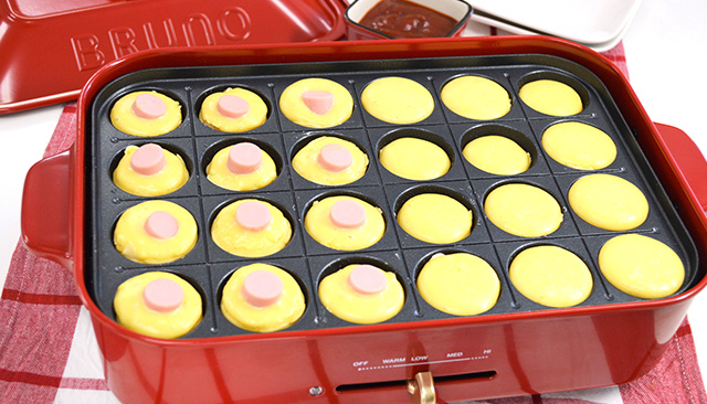 ここがポイント!! たこ焼き器で揚げずに簡単に作れるアメリカンドッグです。 子供と一緒に手作りして、おうち時間を楽しもう! |