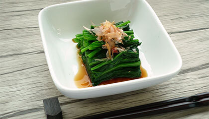 ここがポイント!! 茹でたほうれん草にかつおやチキン等6種類のうま味がきいたぽん酢のコクが加わり、おひたしがさらに美味しくいただけます。 小松菜等、お好みの葉物野菜を使って、アレンジできます。 |
